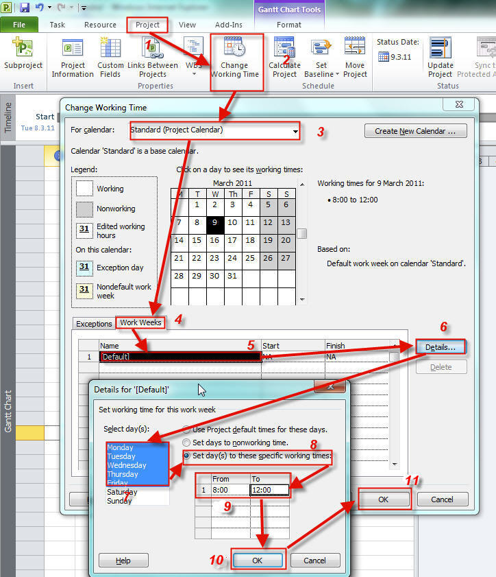 Task 2 will start at 21.3.11 and it will end at 22.3.11. Working time will be from 08:00 till 17:00 (9 hours) at 21.03.11 and 22.03.11 and from 08:00 till 15:00 (7 hours) at 23.3.11, so it will be (9+7 = 16 hours). You can see that the calendar working time is respected (9 hours not 8).”