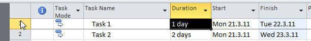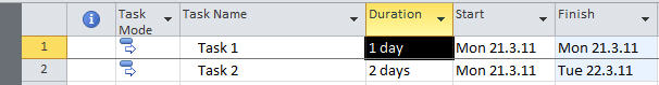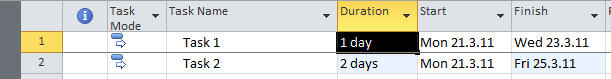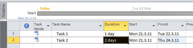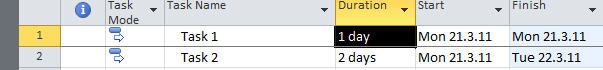 Now you can enter two tasks: Task 1 with 1 day duration, and Task 2 with 2 day duration (type 1d and 2d respectively):