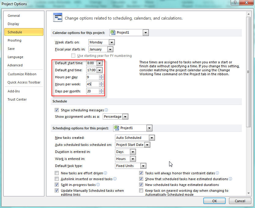 go to File->Options->Schedule, and find out fields: