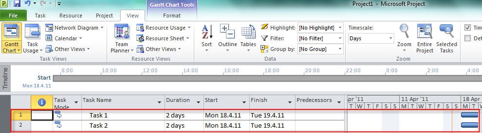 Then I will add two tasks to the Project with same duration –> 2 days: