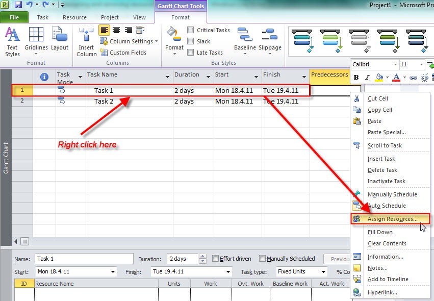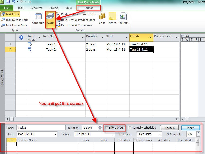 I will click anywhere in the Task Form and I will choose Work in the format Tab: