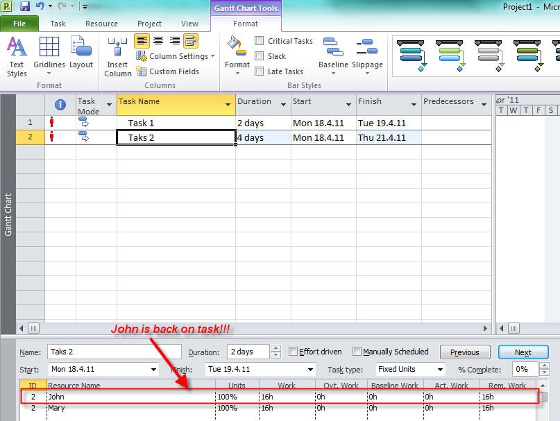 You can see that John has disappeared from the Task Form. But I decided to use the action button and to choose: “Increase total work because the task requires more person-hours. Keep duration constant” or “Increase the hours that resources work per day. Keep duration and work the same”.