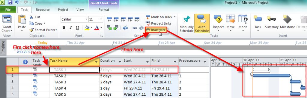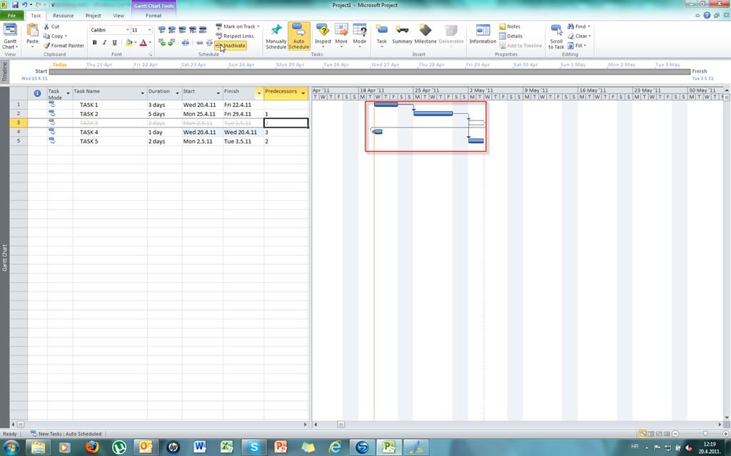 You can see that Task 1 remains as it was, but Tasks 3,4, and 5 are rescheduled to start on 20.04.2010 (start date of the project). This happened because Task 2 is no more active. Task 2 had Task 1 as predecessor but when I made it inactive Task 3 and Task 5 did not change their predecessor to Task 1 automatically. You must make Task 1 as a predecessor of Task 3 and Task 5 by your own: