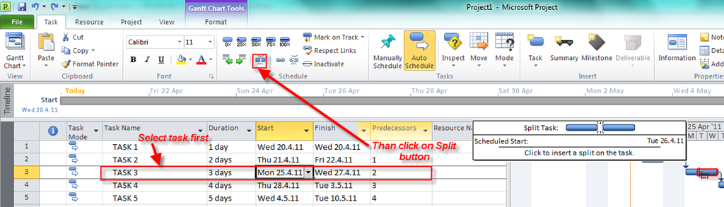 Task 3 has a 3-day duration, and will start on Monday, 25.04.2011 and finish on Wednesday, 27.04.2011. What if your task can be done in 3 days but it must (for any reason) be scheduled on Monday 25.04.2011 then Thursday 28.04.2011 and finally on Tuesday, 03.05.2011.? You can make three different tasks but this is not a good idea. A better approach is to split the task. Here is how it’s done: