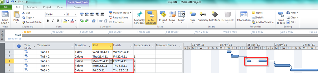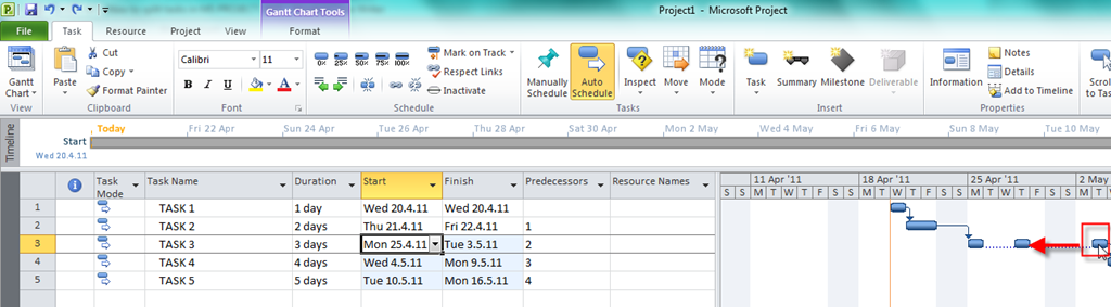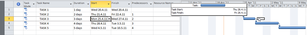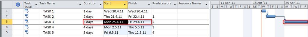 You can see that a dotted line is removed. This picture on the Gantt chart is little confusing because you have a task with a 3-day duration that will start on Monday 25.04.2011 and finish on Friday 29.04.2011. Without a dotted line you can think that this is an error, so I strongly suggest: Leave a dotted line in your Gantt chart.