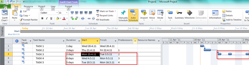 Again, duration of task 3 is unchanged but the start date and end date was changed for Task 4 and 5 because Task 3 is predecessor of Task 4 and Task 4 is predecessor of Task 5