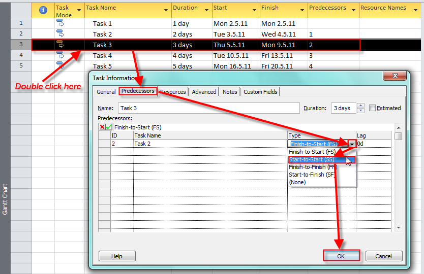 You can see that the Start Date of Task 3 is now the same as a Start date of Task 2, and the End date of Task 3 changed accordingly. And in the Predecessor field of Task 3 you will find 2SS (which means: Task 3 has Task 2 as predecessor, and the relationship is SS – Start to Start)