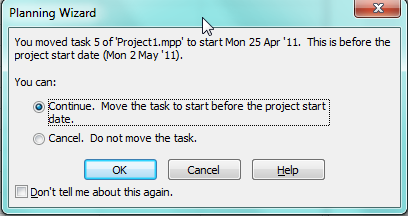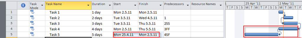 MS Project warns me that if I choose Start to Finish relationship Task 5 will be moved to start date 25.04.2011 which is earlier than project start date (02.05.2011). This happens because in Start to Finish relationship Start date of Task 4 is Finish date of Task 5. Start date of Task 4 is 02.05.2011 and because Finish date of Task 5 is the same and the duration of the Task 5 is 5 days, Start date of Task 5 must be moved 5 days earlier than 02.05.2011 which is 25.04.2011 and it is before the Project start date (02.05.2011). I will choose OK and I will get: