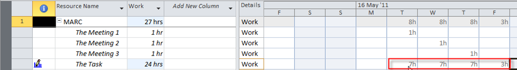 The easiest (but not the best) way to resolve over allocation is to insert (in work field): 7 hours per day for The Task at Tuesday, Wednesday, and Thursday, and 3 hours at Friday (see the picture below):