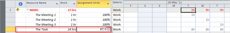 I want Marc to work 7 hours per day at The Task. If he works 8 hours per The Task it is 100% of Assignment Units. 7 Hours is 87,5 Assignment Units (7/8= 0,875 and it means 87,5%). I will insert 87,5 in the Assignment Units field: