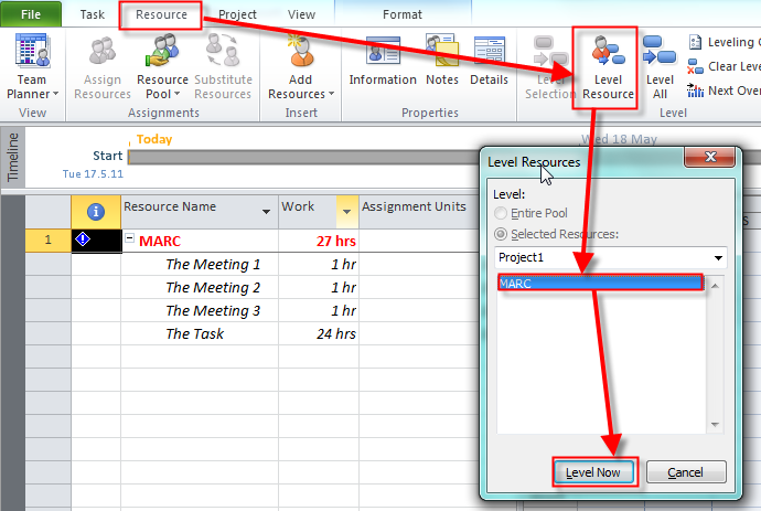I will show you a brief example of how to automatically resolve the over allocation conflict in my example. I will do it for a single resource (MARC).