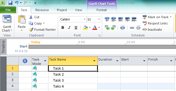I will show you what happens when you link manually scheduled tasks and auto scheduled tasks in MS PROJECT 2010. First, I will enter four tasks in manually scheduled mode: