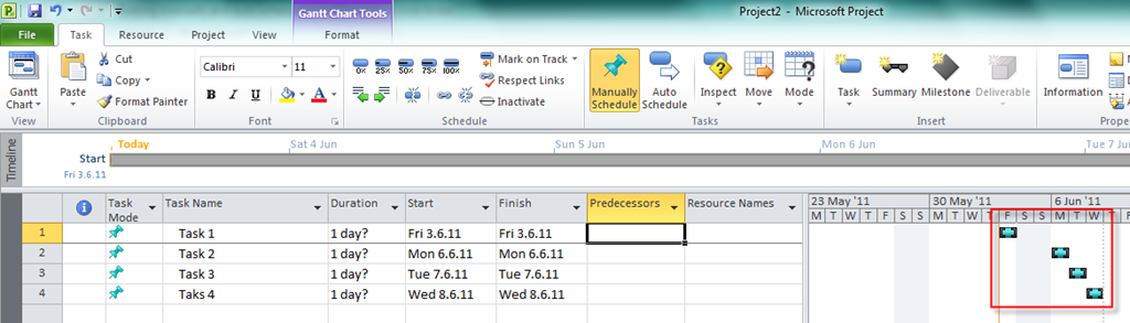 Task 1 and Task 3 has 1 day duration by default and Start date is same as the project start date. I put 02.06.11 as a Start date for Task 2 (manually scheduled) and 01.06.11 as a End date for Task 4 (manually scheduled). OK. Now I will link them as I did before and I will get:
