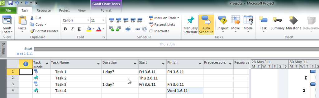 Task 2 and Task 4 has 1d (estimated) duration, and they also have Start and End date set by MS PROJECT 20101. Remarks in Start date and End date fields are overwritten.