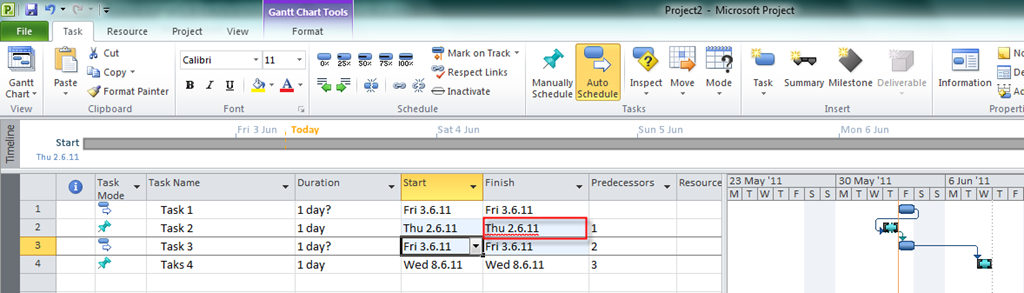 But, what if I really want 02.06.11 as a start date for Task 2? I will enter that date in Start date field and I’ll get: