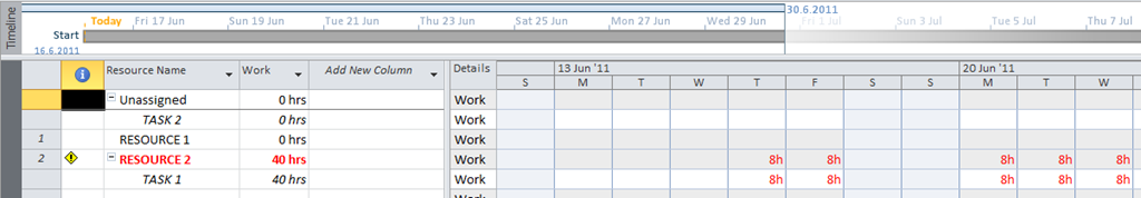 RESOURCE 2 is over allocated from 16.06.2011 to 22.06.2011 because he is available from 01.07.2011 to 15.07.2011. If you open Resource usage sheet you will also see that over allocation:
