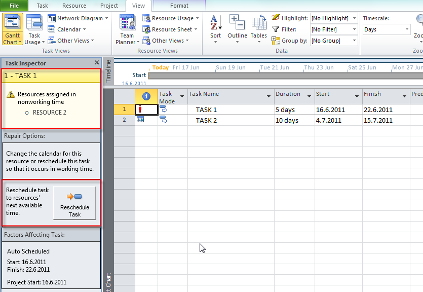 You can see the warning message in the upper left corner of the Task Inspector. It says: “Resource assigned in nonworking time _ PRESOURCE 2”. If you don’t want to leave this over allocation “AS IS” you can only choose “Reschedule Task”. I will do and and I will get: