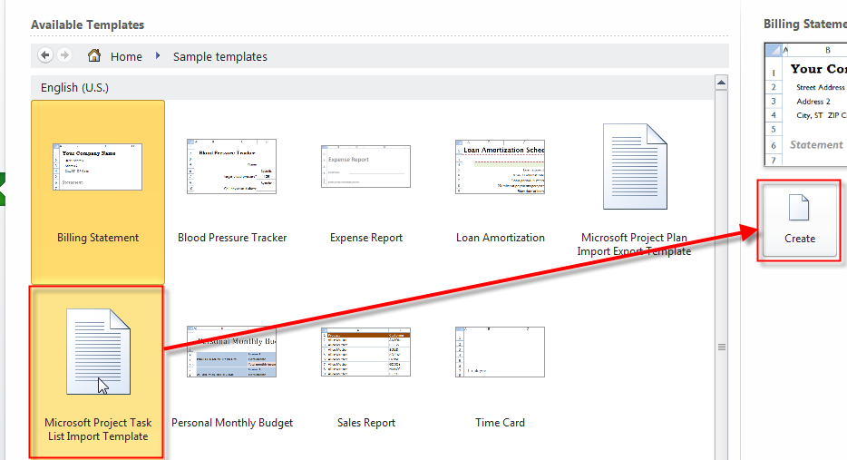 3. Click on Microsoft Project Task List Import Template and then click on the Create button: