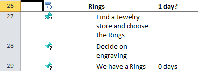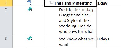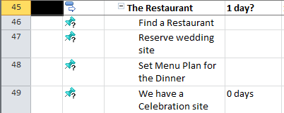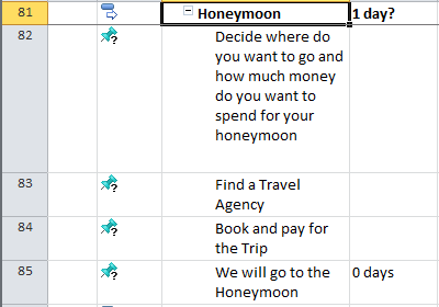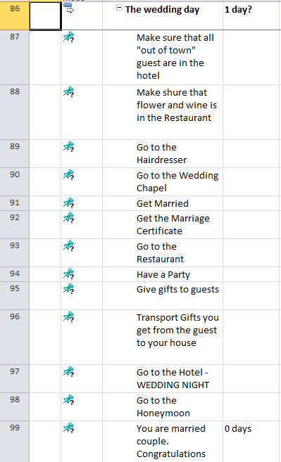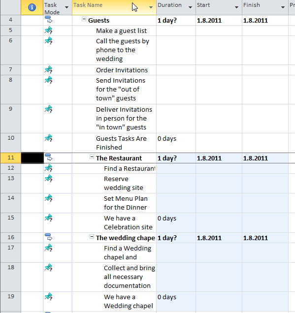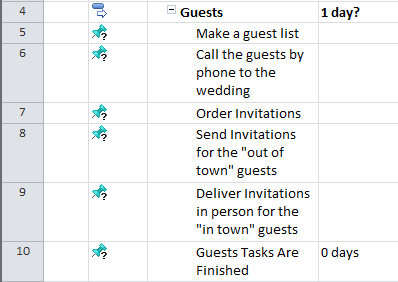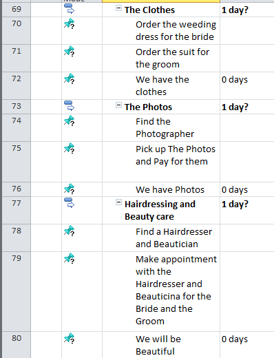 I have made the Scope for my “Wedding” Project in MS PROJECT 2010. I have task groups (called “summary task”), and each group have a milestone at the end. Those groups are not order logically, and it means that I put them as they cross my mind.