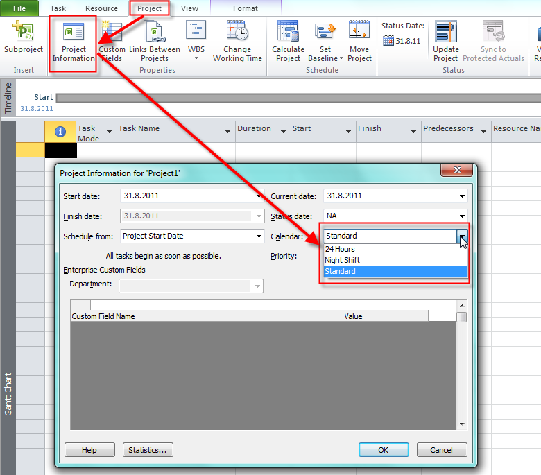 There are three “built in” Calendars in MS PROJECT 2010: Standard, Night Shift and 24 hours. You can see them here: