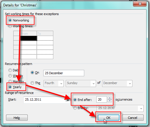 I told that Christmas is so called “Recurring” exception, and that it is Nonworking day and that it recur every Year. I put 20 in the number of occurrences, so I do not have to be worried for next 20 years about Christmas, and my “Wedding” Project will be finished much, much earlier than 20 years from now (I hope