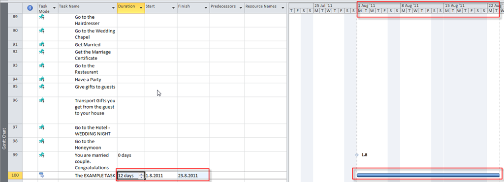 What do I get? Well, there will be no activity during this period! I will give you example. I will add a brand-new task in my “Wedding” Project in auto schedule mode, and I will tell that it will have 12 days duration and I will get: