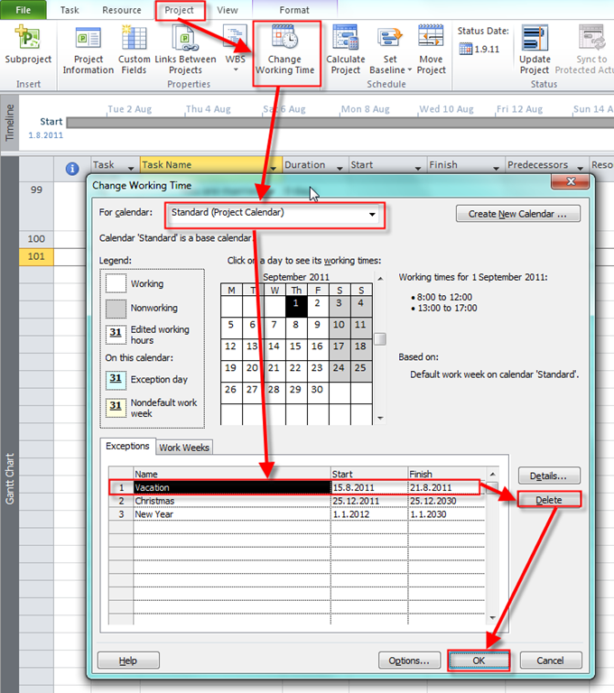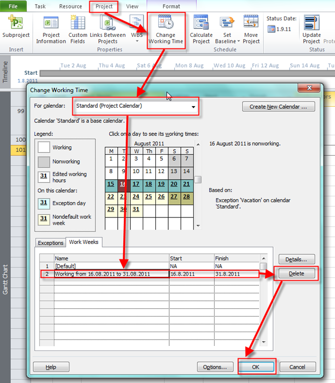 Now, I will remove my Vacation from exception from MS PROJECT 2010 Calendar: