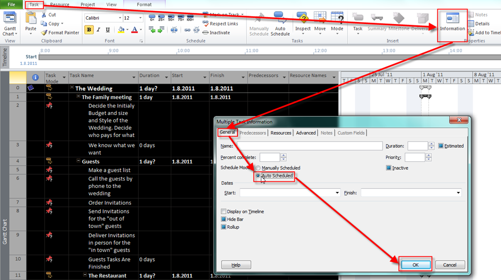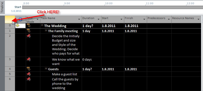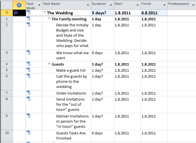this post might be very boring! Because I am using the “Wedding” project I will put duration for each and every task! There are 100 task and I had to explain why I put those duration for each task. But, you know what? I won’t do it! I will show to you how can you put those duration to the tasks, and I will give you a link to my “Wedding” Project so, if you are interested in watching this example, just download it!