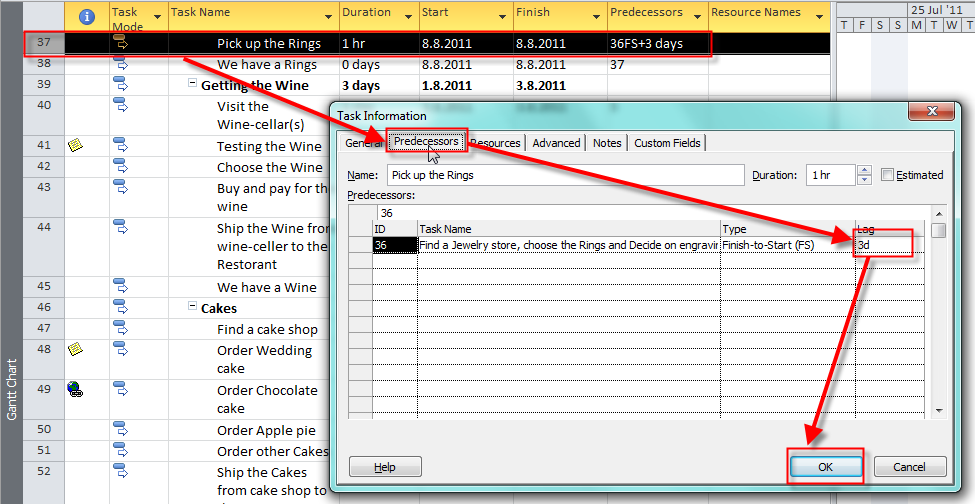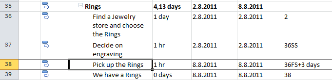 Everything is fine now. Now look at the task 37. Pick up the Rings. It has 1hour duration but in the Predecessors column you can see 36FS+ 3 days. 36 FS means that task 36 is a Predecessor and it has finish to start relationship. +3 days is LAG. Lag is also known as “waiting time”. In my example you can not pick up those Rings when you find the Jewelry store. you have to wait for some time before those rings will be ready. How do I know how much time do I have to wait!? By experience. Do not forget, that we are still in a Planning phase. When we will find a Jewelry store, and when we will decide on rings, then we will know how much time do we need. Until then that is only estimation (like everithing is Smile)