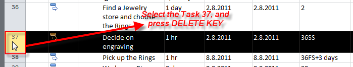 Task no 36. “Find a Jewelry store and choose the Rings” have one day duration. Task 37. “Decide on engraving” should start in “parallel” with task 36. Why? Well, I can make them with the finish to start relationship (which means that I will first have to finish task 36, and after that start with task 37), but it will be silly, because it will means: “When you finish with finding a Jewelry store and choose the Rings, GO HOME, and COME BACK NEXT DAY TO SPEND 1 HOUR ON DECIDING ON ENGRAVING”. Instead of that I make those two tasks as Star to Star, which means, when you start with task 36, you can start with task 37. But, this is still not correct 100%. The best way is to make 1 task instead of two. So I will delete Decide on engraving task and I will marge it with task 36. “Find a Jewelry store and choose the Rings”