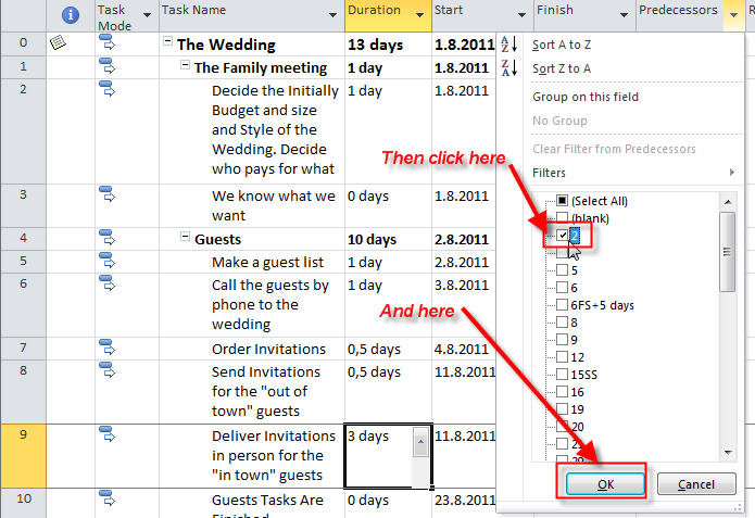 OK! Now the trick! I want to see all tasks with Predecessors NO 2, and only them. I can do it with filter: