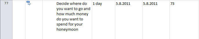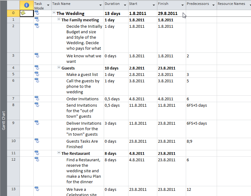 OK. This problem is solved. What with Task no 6: “Call the guests by phone to the wedding”? It is a Predecessor of lot of other Tasks. That will be explained in my next blog post. And after that we will know the wedding date and we will be ale to schedule unscheduled tasks.