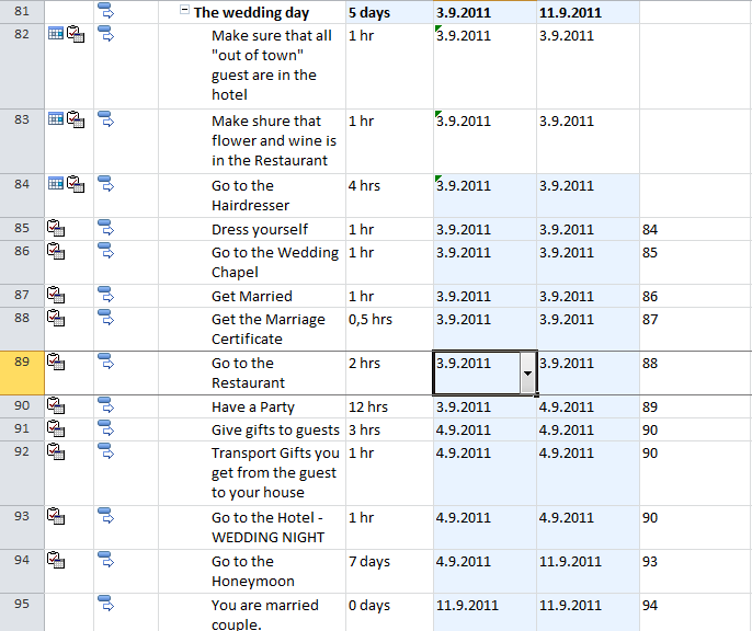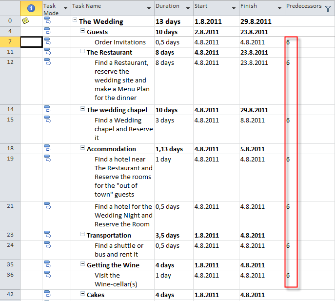 In my previous post I have explained that Task no 6: “Call the guests by phone to the wedding” is a Predecessor of lot of other Tasks. I will again apply a filter to see those task: