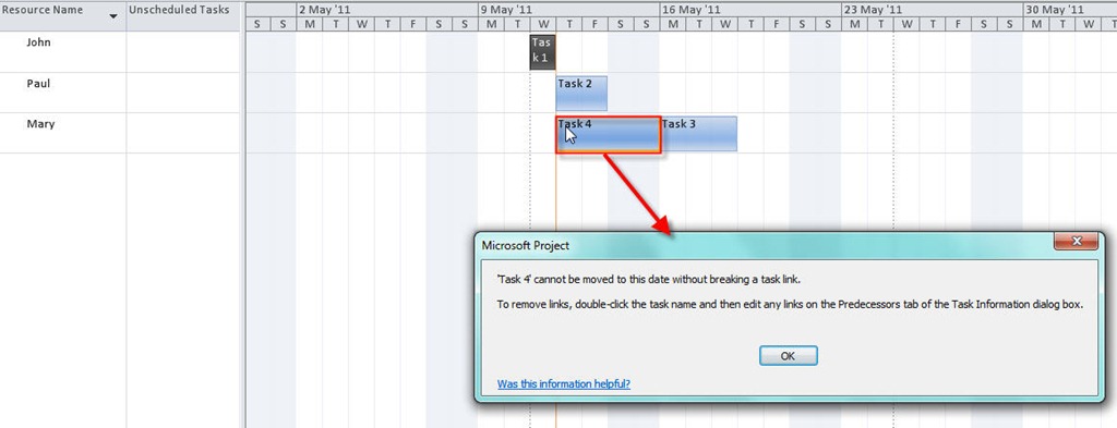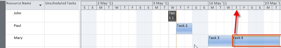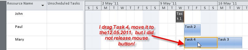 You can see that MS PROJECT did not allow me to reschedule Task 4. It only allows me to move the Task from John to Mary, but not to reschedule it EARLIER. If I had tried to move Task 4 from 19.05.2011 to, for example, 20.05.2011, MS PROJECT would have allowed me to do that.