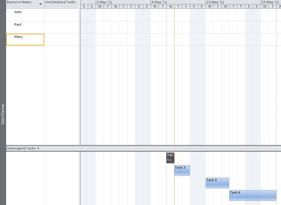 You can see that John Paul and Mary don’t have any tasks assigned, and that all tasks are unscheduled (because I left them in manually scheduled mode)