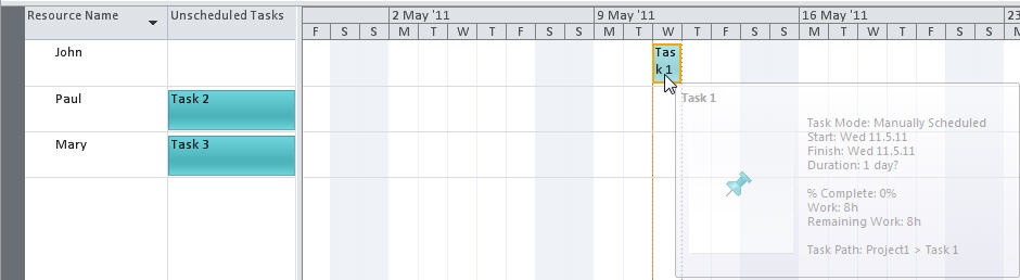 You can see that those Tasks are assigned but not scheduled. Now I will drag and drop Task 1 and put it to start on Wednesday 11.05.2011:
