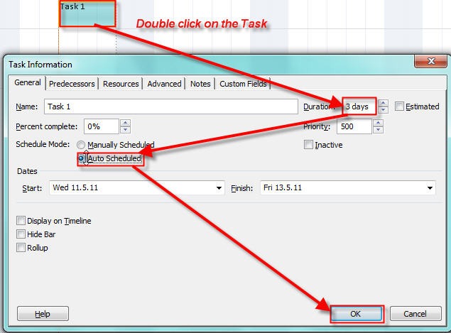 Now I will double click on Task 4 and I will set 3 duration days (automatic scheduled):