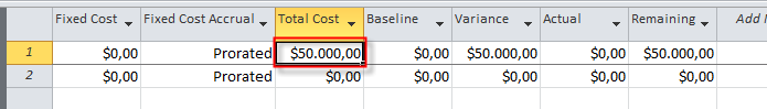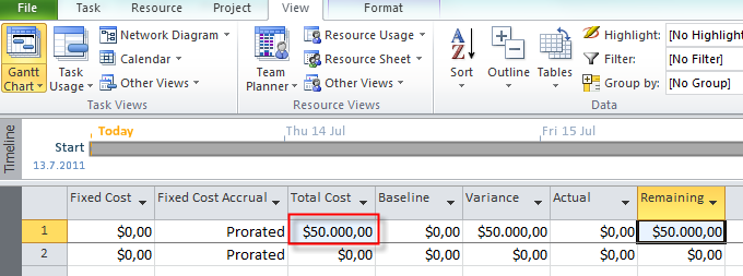 I put 1000 in the Unit field, because I assume that I will need 1000 liters of paint for painting the wall. MS PROJECT 2010 has calculated that the cost is $50.000 (1.000 units X $50 per Unit = $50.000). Remember that this cost remains the same, no matter how long will take you to pain the wall. I will show it to you. First I will choose the Cost table: