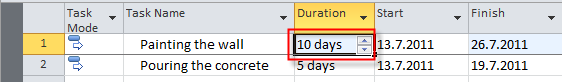 Now I will change duration for task Painting the wall from 3 to 10 days: