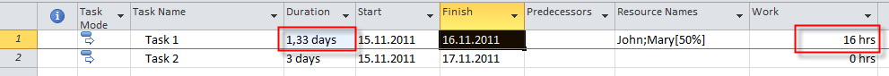 Since I add Mary with 50% on the task and I want to keep same amount of work (that is 16 hours) those hours has to be split between John and Mary. On the first day, John and Mary will work their full time (e.g. John 100% and it mean 8 hours, and Mary 4 hours per day). That is 12 hours. And now MS PROJECT 2010 has to split remaining work and that is 16-12 hours = 4 hours! John will work 2/3 (e.g. 66,67%), and Mary 1/3 (e.g. 33,33%), and that is 2,67 hours for John, and 1,33 hours for Mary!