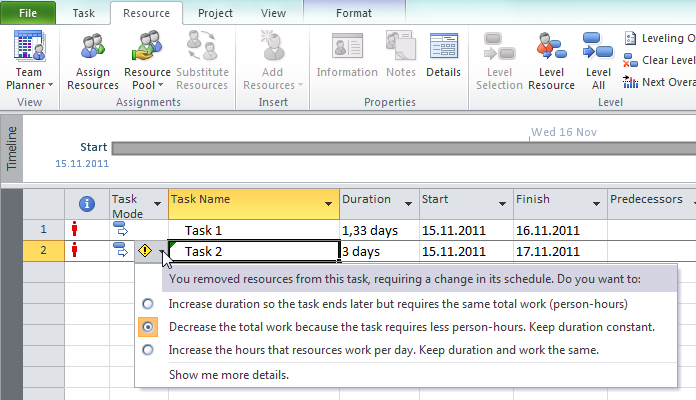 As you can see, Task Duration is now 1,33 days, and in the Work field I got 16 hours. Now let’s see Task Usage View: