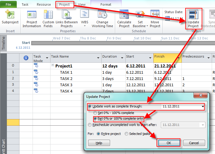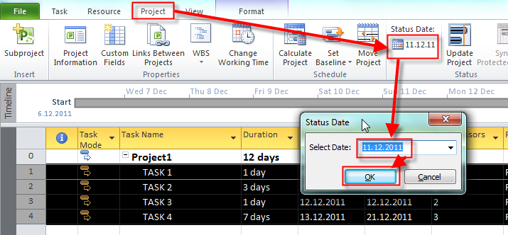 As you can see, Task 1 and Task 2as market as Completed, because only this two task are scheduled to finish on (or before) status date which is 11.12.2011.