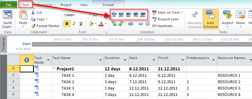 Why? Simple, the whole Project has 12 days duration. And because I marked the whole Project as 50% finished, it means that the resources spent 6 days (50% of 12 days) on the Project. And since Task 1 has 1 day duration, Task 2 has 3 days duration, and Task 3 has 1 day duration, they are finished (Task1 + Task2 + Task3 = 5 days). The remaining 1 day from 6 days spent on the project is on Task4, as you can see on the picture above.
