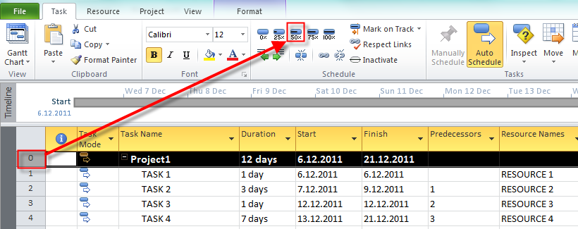 I can choose between: 0%, 25%, 50%, 75%, and 100%. For my example let us suppose that the whole Project is finished 50%. I will select the Project Summary Task (Task 0) and click on the 50% Button: