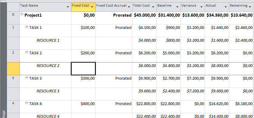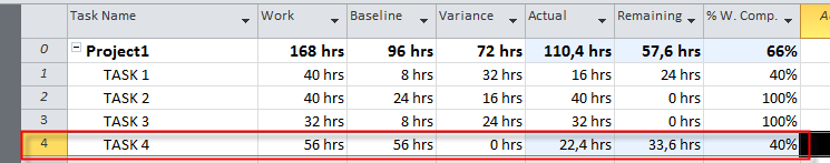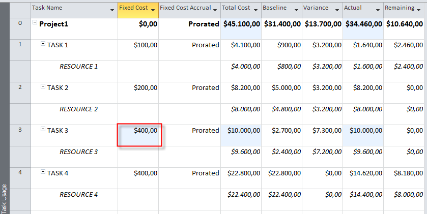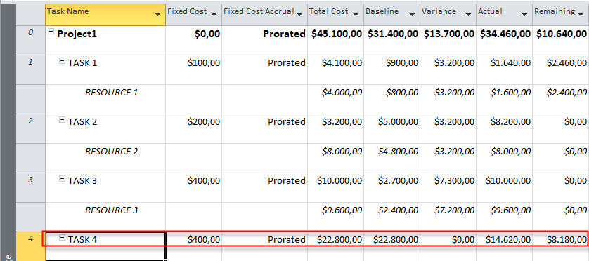 Now I can put manually Actual Costs. For example notice that Task4 I have: