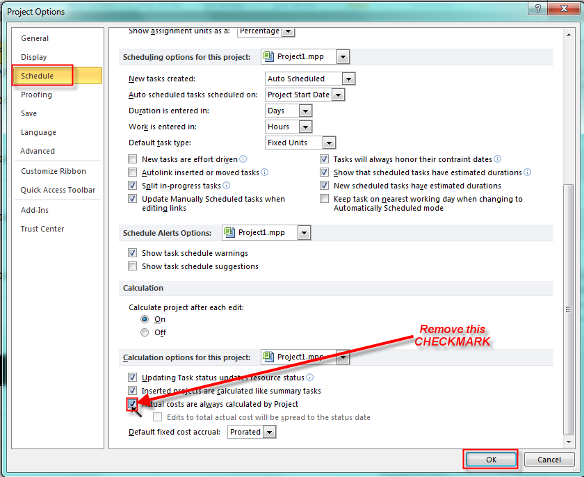 But what can you do with Costs for resources. They are calculate automatically. You can leave them “as is”, and let MS PROJECT 2010 to calculate those values based on price per hour, day etc. for the Resource and hours spent on the Tasks. Or  you can put all the costs manually. To do that you should set MS PROJECT 2010 up: