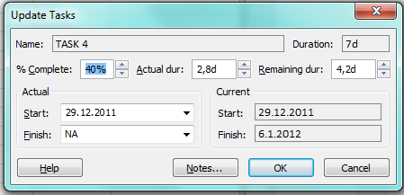 40% of 56 hours is 22,4 hours, and you can see this value in the Actual field, and the Remaining is 56-22,4  = 33,6 hours. I will open the Status window for the Task4: