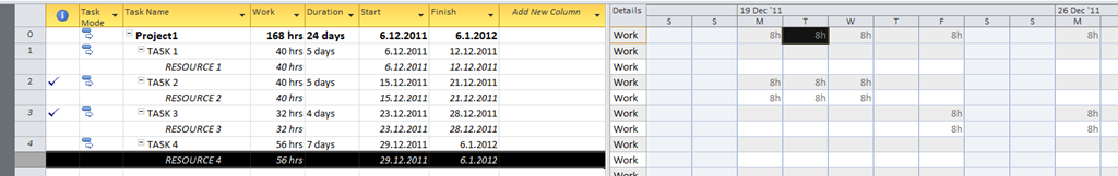 As you can see, in this Table I have work in hours which is based on formula Duration in days X Hours per day. For the Task4, Duration is 7 days, e.g. 7 days X 8 hours per day = 56 hours!