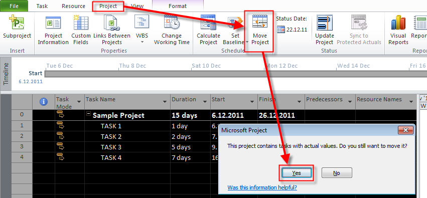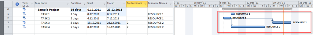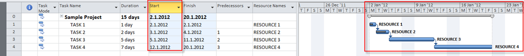 Notice that start date of the Task2 is unchanged, because the activities on that task were started before moving the whole Project, and you have “strange” finish to start relationship. Also notice that for Task3, and Task4 the Start no earlier is set: