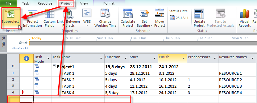 Now I will select the first blank row below Project2, and I will insert a new Sub Project, as I did it before, and I will get: